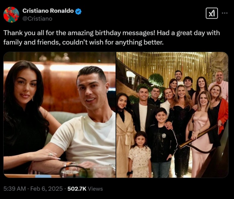 C羅寫道:感謝大家送上的精彩生日祝福!我和親朋好友一起度過了美好的一天,沒有什么比這更好的了。