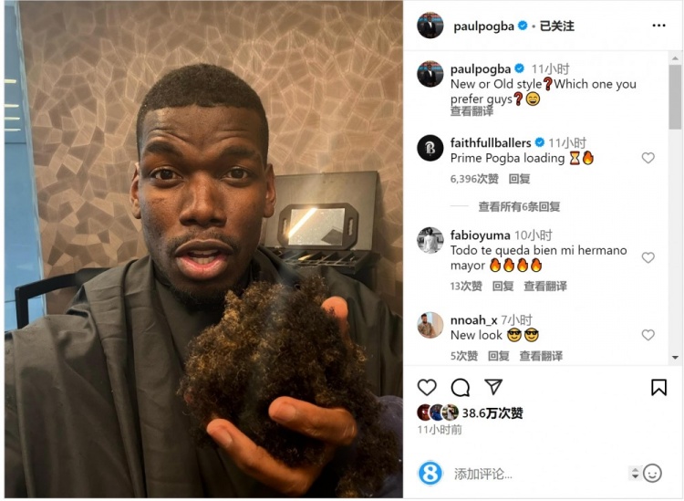 博格巴社媒曬出自己坐在理發(fā)椅子上的照片,他的手里拿著一大團剪下的頭發(fā),配文:“新發(fā)型還是舊發(fā)型,你們更喜歡哪一個?”