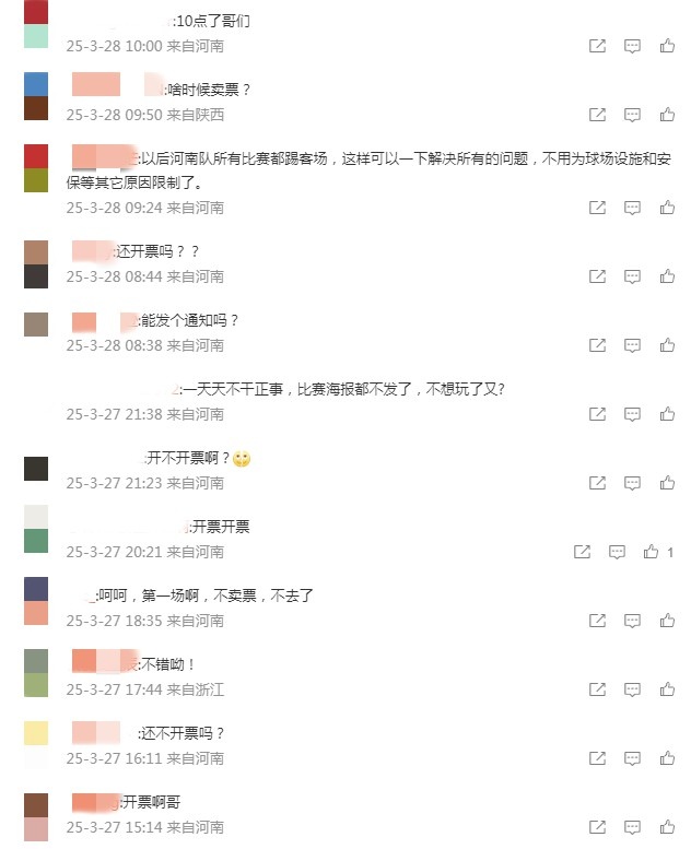 根據(jù)賽程安排,河南隊將在本輪聯(lián)賽主場對陣上海申花,比賽時間為3月29日(星期六)18:00。在賽前僅剩一天的時候,俱樂部仍未售票,也沒有相關公告,這讓球迷等得非常急迫。在河南隊官方微博的評論區(qū),球迷們在持續(xù)催促售票。
