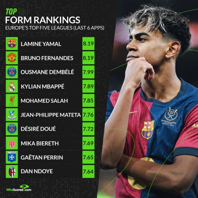 3月28日訊 國家隊(duì)比賽周已經(jīng)結(jié)束,whoscored統(tǒng)計(jì)了五大聯(lián)賽此前6輪的場(chǎng)均評(píng)分情況,亞馬爾和B費(fèi)并列居首。