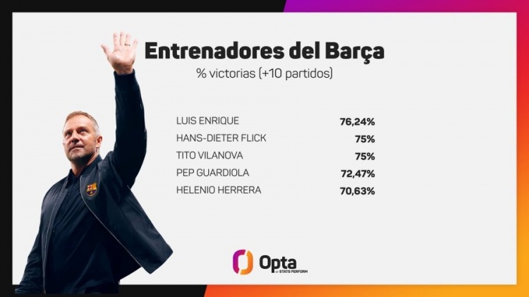 數(shù)據(jù)統(tǒng)計(jì)顯示,弗里克在巴薩各項(xiàng)賽事44場取得33勝,75%勝率追平比拉諾瓦。在隊(duì)史執(zhí)教超過10場的教練中,勝率僅次于恩里克(76.24%)。瓜迪奧拉勝率72.47%位列第四,埃倫尼奧-埃雷拉以70.63%勝率位列第五。