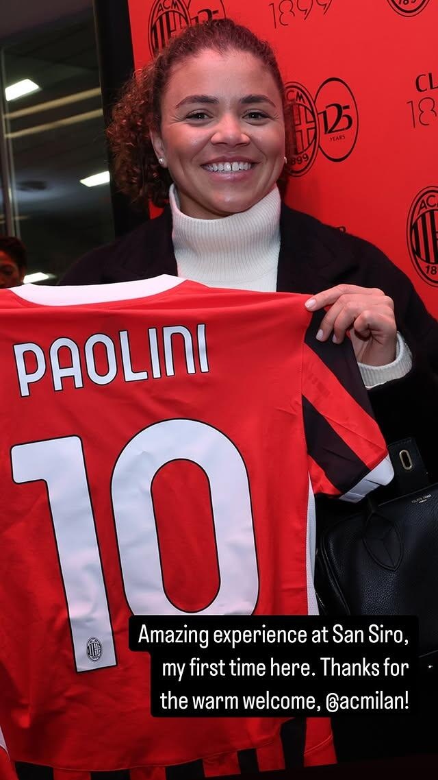 與此同時,保利尼還獲贈一件印有她名字的米蘭10號球衣,她在社媒寫道:“在圣西羅的非凡體驗,這是我第一次來這里,謝謝米蘭的熱烈歡迎。”