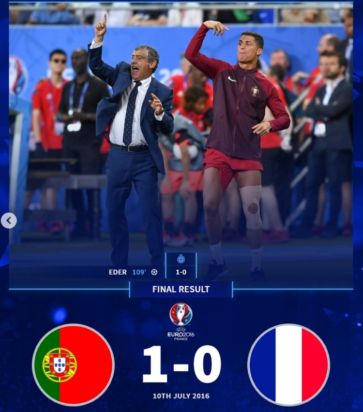 2016年歐洲杯決賽葡萄牙1-0法國:幾乎一己之力扛著葡萄牙闖進(jìn)決賽的C羅傷退,他在場邊指揮比賽的場面也成為經(jīng)典,最終替補(bǔ)神兵埃德一劍封喉,幫助葡萄牙奪得隊(duì)史歐洲杯首冠。