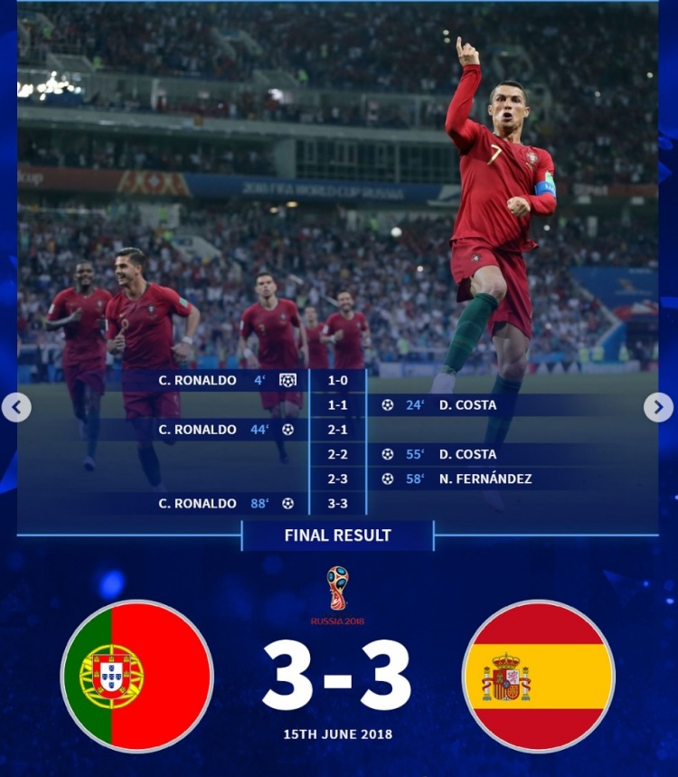 2018年世界杯小組賽,葡萄牙3-3西班牙:迭戈-科斯塔雙響,納喬穿云箭,C羅上演帽子戲法,最后的任意球破門更是因?yàn)樗髁P前堅(jiān)定的眼神,和央視解說“翩若驚鴻婉若游龍”成為經(jīng)典。