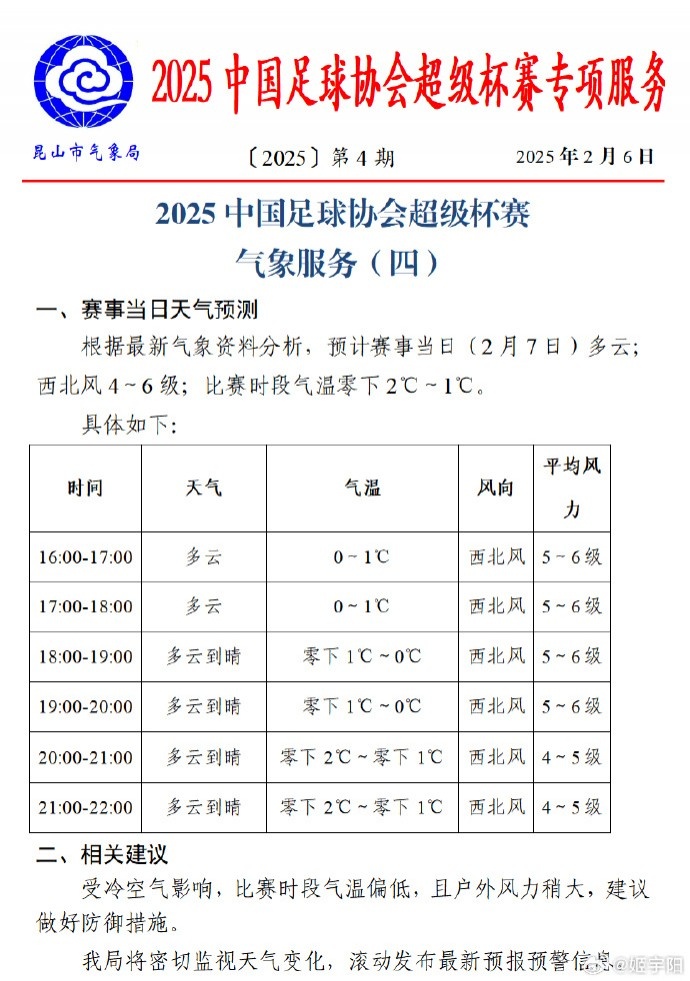 根據天氣預報的情況,預計賽事當天昆山為多云天氣,西北風4-6級,比賽時段氣溫零下2度-零下1度。