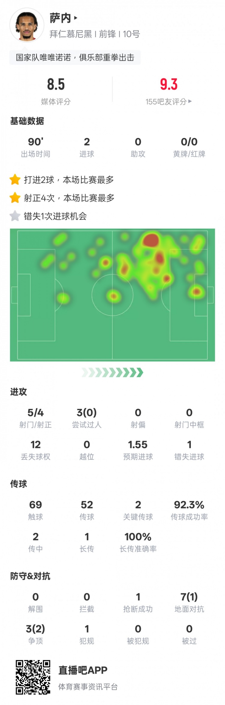 3月30日訊 德甲第27輪,拜仁3-2圣保利,薩內首發(fā)出戰(zhàn),打進2球,送出2次關鍵傳球,錯失1次進球機會,評分8.5。