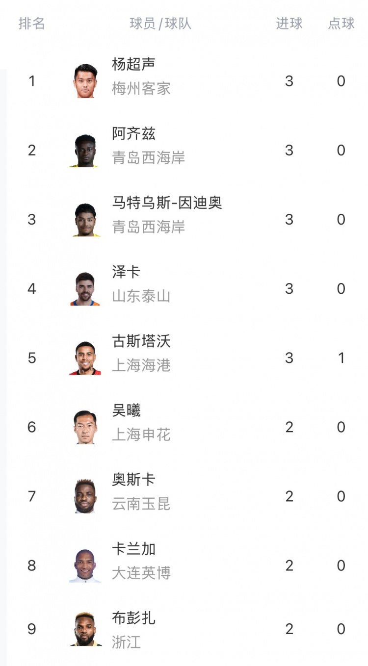 3月30日訊 中超聯(lián)賽第三輪比賽已全部結(jié)束,目前截止第三輪,共有5名球員以3粒進(jìn)球的數(shù)據(jù)并列射手榜第一。