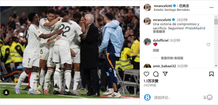 皇馬主帥安切洛蒂社媒曬出與球員們慶祝的照片,并配文:“一場(chǎng)奉獻(xiàn)和犧牲精神帶來(lái)的勝利,我們繼續(xù)前進(jìn)!”
