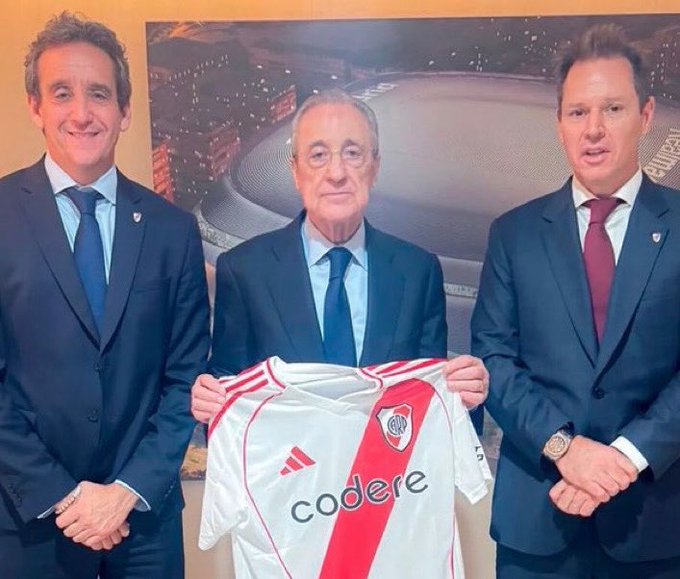 布里托與皇馬主席弗洛倫蒂諾合影,并向后者贈送了河床球衣。