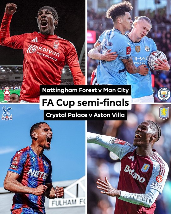 足總杯4強對陣:曼城vs諾丁漢森林,水晶宮vs維拉。