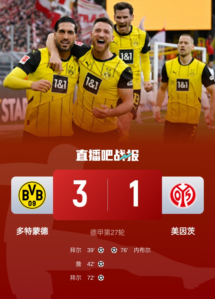 德甲第27輪,多特3-1美因茨,拜耳梅開二度,詹破門。