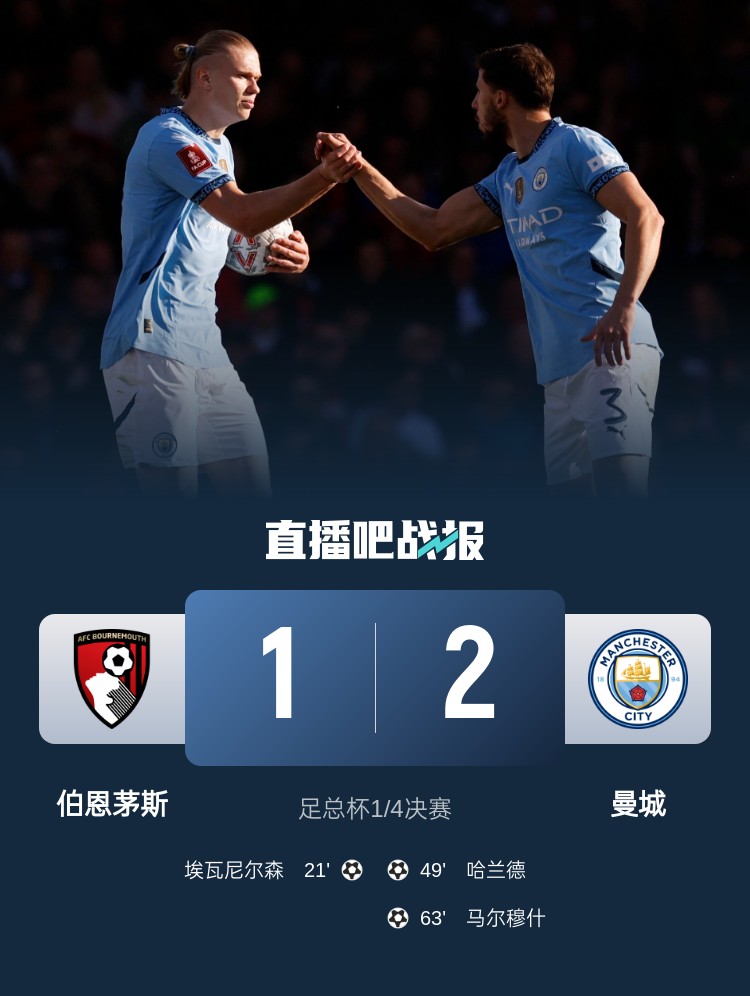 足總杯1/4決賽,曼城2-1逆轉(zhuǎn)伯恩茅斯,哈蘭德破門+傷退,奧賴利2助攻。