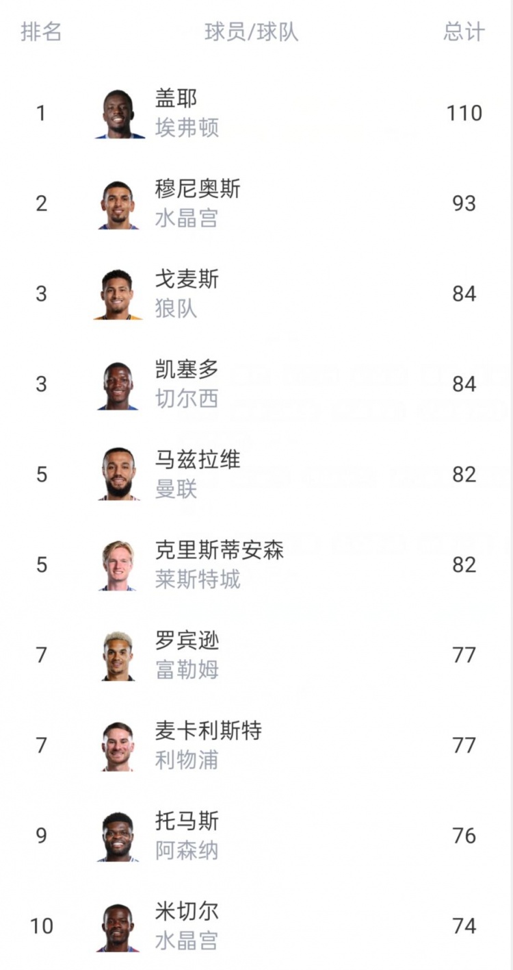 本賽季到目前為止,英超球員搶斷統(tǒng)計(jì)排名如下: