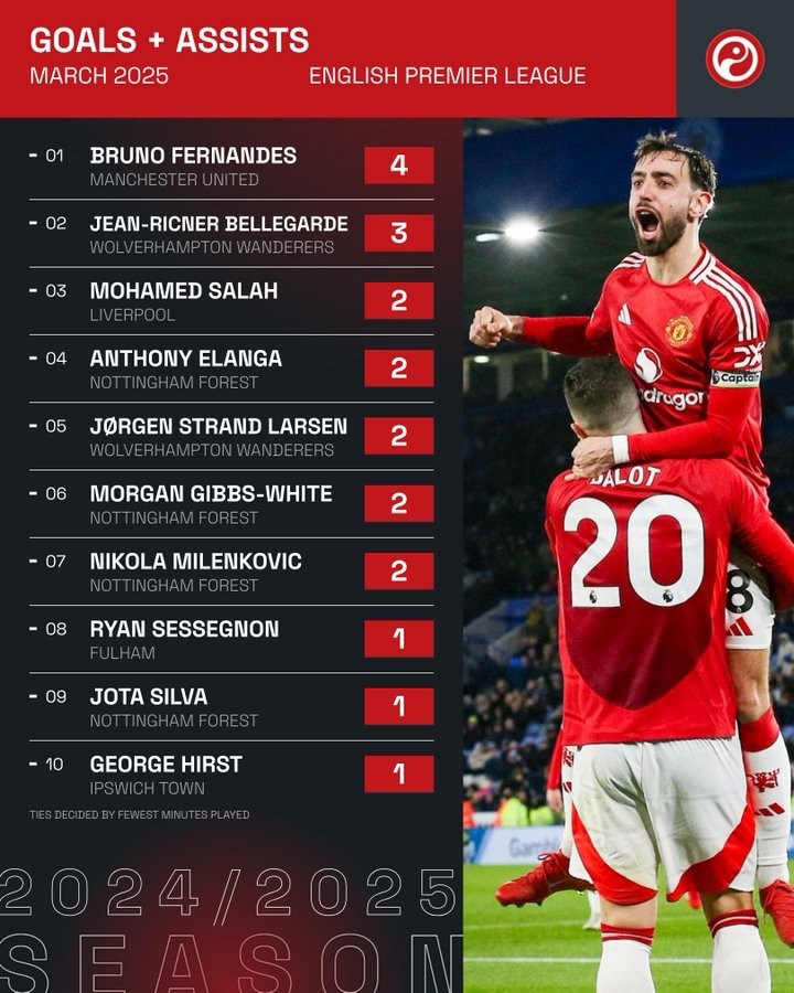 4月1日 據(jù)Squawka統(tǒng)計,B費參與了曼聯(lián)在三月份英超聯(lián)賽中所有的4個進(jìn)球,這在英超球員中排在第一位。