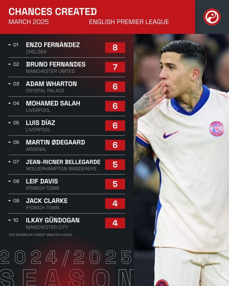 4月1日訊 Squawka統(tǒng)計了3月份球員在英超創(chuàng)造機會的次數(shù),并列出榜單,恩佐8次居首,B費7次第二。