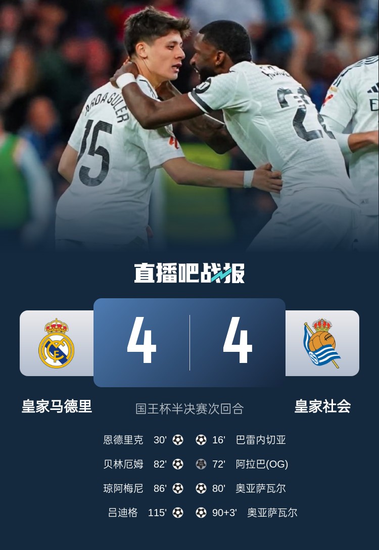皇馬4-4總比分5-4皇社,加時絕殺晉級國王杯決賽,呂迪格打入制勝一球!皇馬將戰(zhàn)巴薩和馬競之間的勝者。