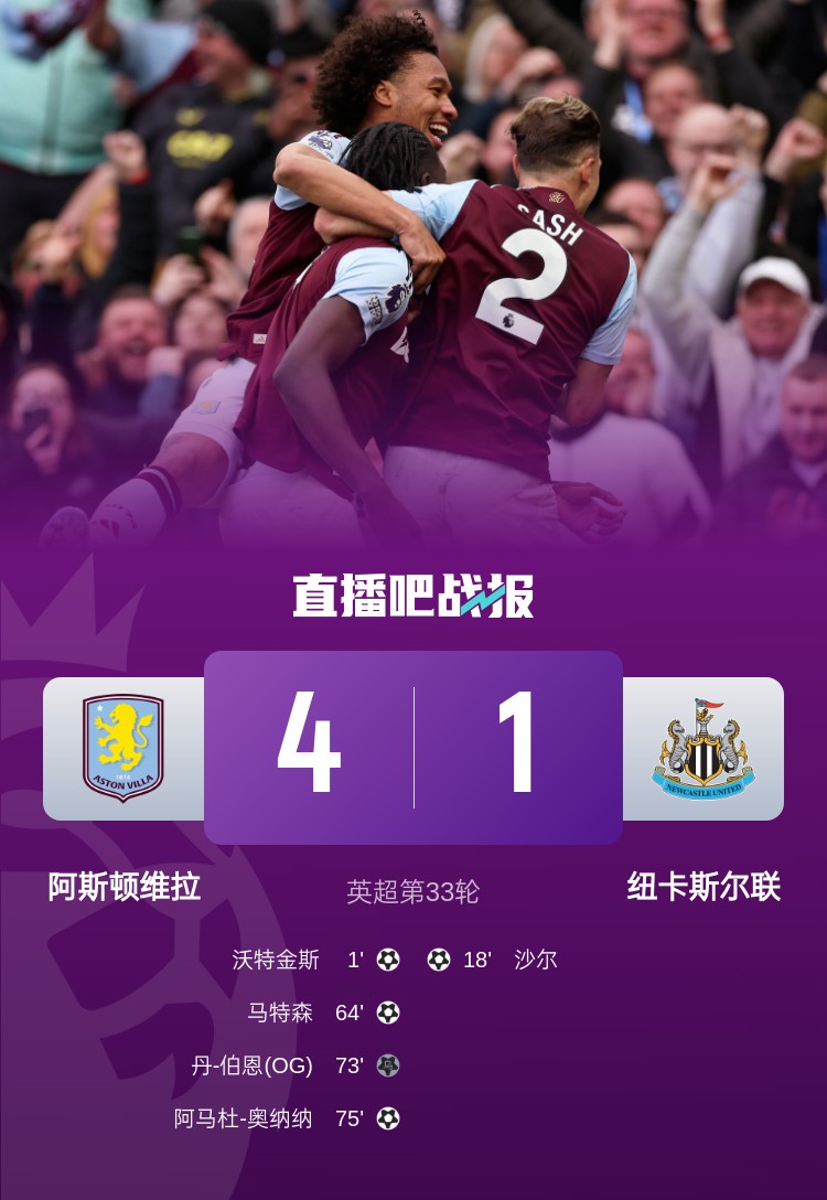 英超聯(lián)賽第33輪,阿斯頓維拉4-1大勝紐卡斯爾聯(lián),沃特金斯傳射,馬特森進球。