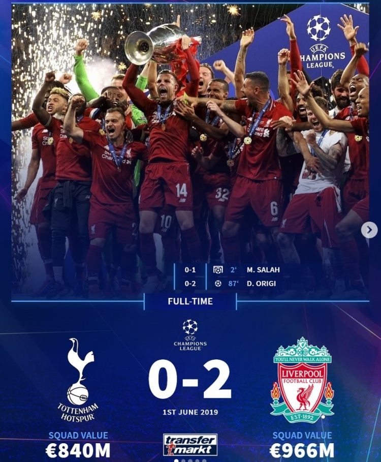 2019年6月,歐冠決賽:熱刺0-2利物浦,此前長(zhǎng)期受傷的凱恩火線復(fù)出表現(xiàn)不佳,薩拉赫開場(chǎng)閃擊、奧里吉鎖定勝局。