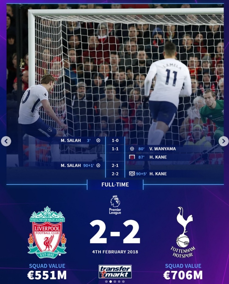 2018年2月,英超:利物浦主場(chǎng)2-2熱刺。薩拉赫開場(chǎng)閃擊,萬(wàn)亞馬替補(bǔ)世界波扳平,凱恩第87分鐘失點(diǎn),薩拉赫第91分鐘“絕殺”,凱恩第95分鐘再次主罰點(diǎn)球完成絕平。