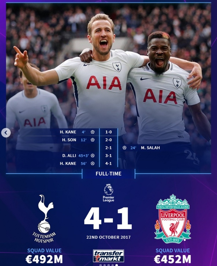 2017年10月,英超:熱刺主場(chǎng)4-1利物浦。孫凱上半場(chǎng)各進(jìn)一球,薩拉赫扳回一城,阿里上半場(chǎng)補(bǔ)時(shí)破門,凱恩下半場(chǎng)再進(jìn)一球鎖定勝局。