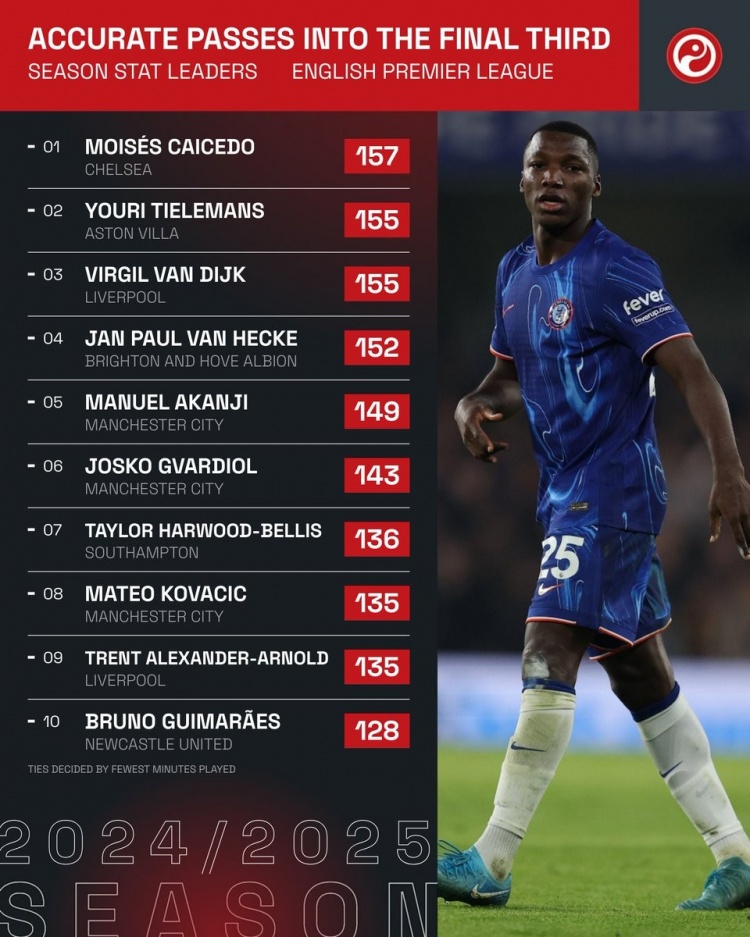 本賽季英超傳球到進(jìn)攻三區(qū)榜:(次數(shù)相同,出場時間更少者排名在前)