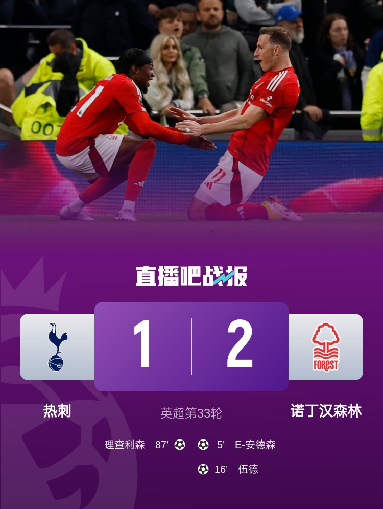 熱刺1-2不敵森林,賽季遭對手雙殺!森林終結(jié)英超2連敗,排名升至第3。