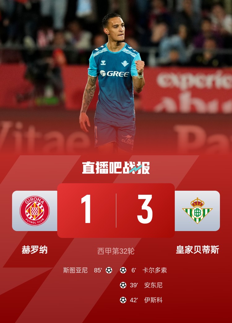 伊斯科傳射,安東尼破門,貝蒂斯3-1完勝赫羅納,先賽距歐冠區(qū)僅1分!