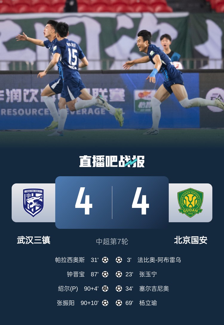 易帥后,武漢三鎮(zhèn)在主場(chǎng)3-1擊敗云南玉昆,狀態(tài)回暖。隨后迎戰(zhàn)國(guó)安,國(guó)安半場(chǎng)取得3-1領(lǐng)先,下半場(chǎng)國(guó)安又將比分?jǐn)U大為4-1。