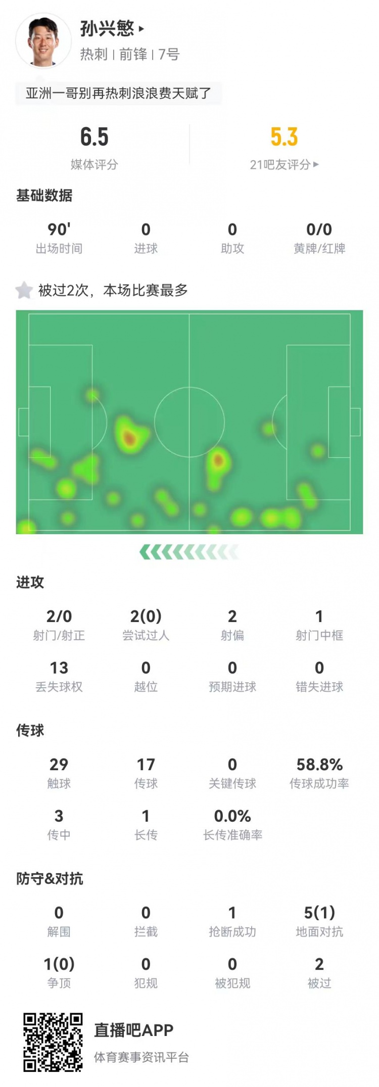 2月7日訊 熱刺在本輪聯(lián)賽杯被利物浦4-0擊敗,孫興慜本場(chǎng)數(shù)據(jù)如下: