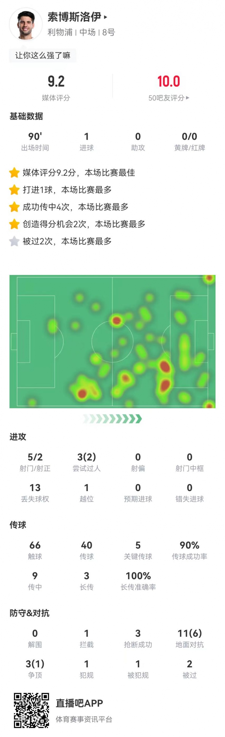 2月7日訊 利物浦在本輪聯(lián)賽杯4-0擊敗熱刺,索博斯洛伊本場(chǎng)數(shù)據(jù)如下: