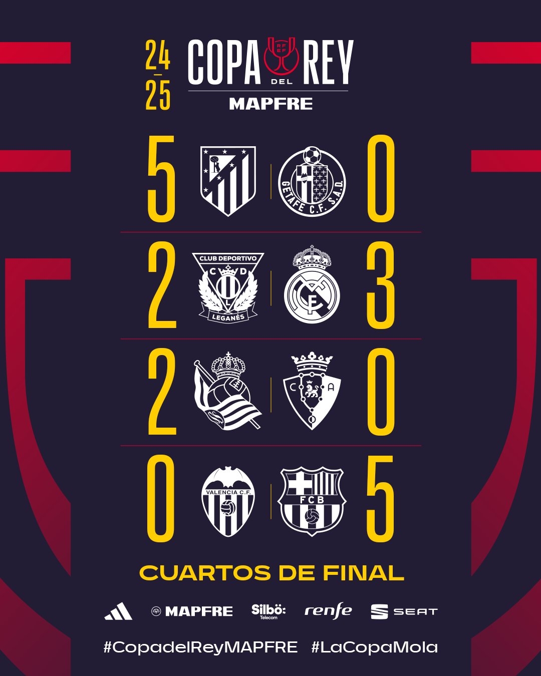 02月07日訊 今日凌晨國(guó)王杯8強(qiáng)賽,巴薩5-0大勝瓦倫西亞,與皇馬、馬競(jìng)、皇社共同晉級(jí)4強(qiáng)。