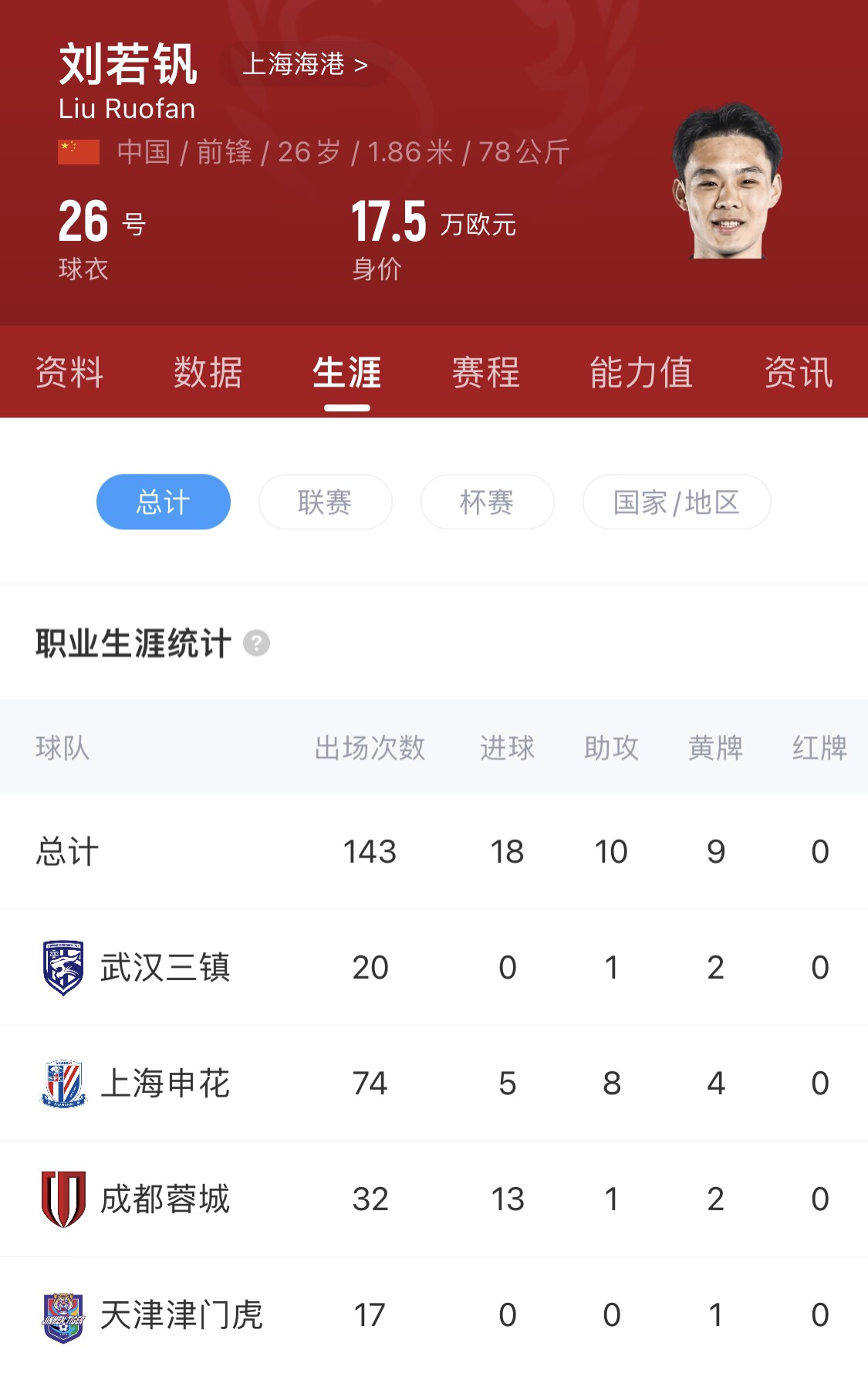 現(xiàn)年26歲的劉若釩,司職中鋒、邊鋒、邊前衛(wèi),出身根寶基地轉(zhuǎn)投上海申花后,2017年完成首秀。