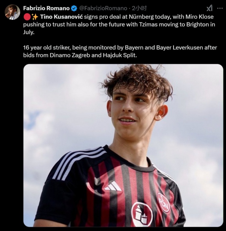 2月7日訊 名記羅馬諾消息,拜仁和勒沃庫(kù)森持續(xù)關(guān)注紐倫堡小將庫(kù)薩諾維奇。