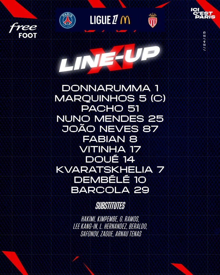巴黎圣日耳曼首發(fā):多納魯馬;馬爾基尼奧斯、帕喬、門德斯、內(nèi)維斯;法比安、維蒂尼亞、杜埃;克瓦拉茨赫利亞、登貝萊、巴爾科拉