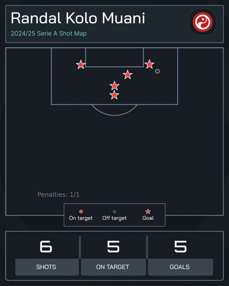 數(shù)據(jù)統(tǒng)計顯示,穆阿尼為尤文3場意甲打進5球,共計僅射門6次且全部射正。
