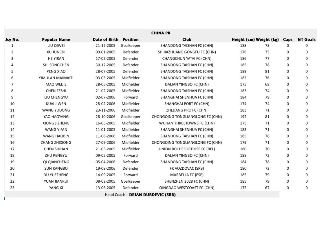 中場:6-依木蘭-買買提(山東泰山)、7-毛偉杰(大連英博)、8-陳澤仕(山東泰山)、10-蒯紀(jì)聞(上海海港)、11-王鈺棟(浙江)、13-熊繼政(武漢三鎮(zhèn))、14-王一凡(上海申花)、15-王昊斌(山東泰山)、16-張志雄(重慶銅梁龍)、17-陳仕晗(羅什福爾聯(lián)合)