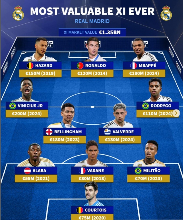 德轉(zhuǎn)列皇馬隊史身價最貴陣:總身價13.5億歐元