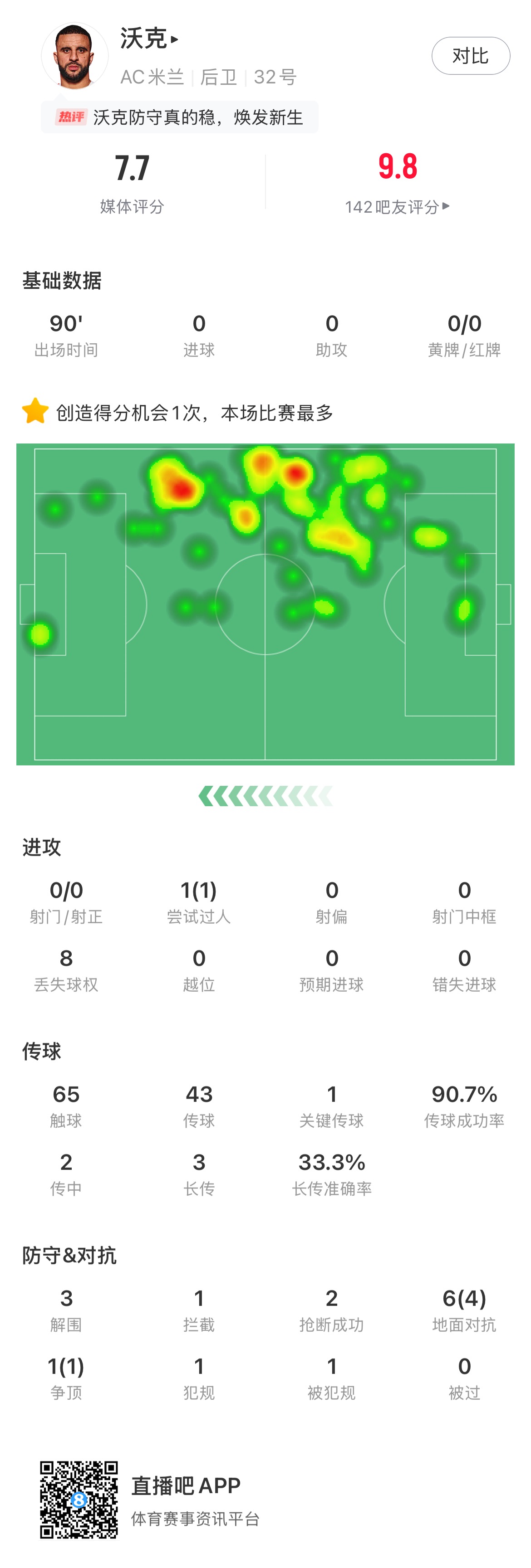 本場沃克1次過人0次被過,6次對抗4次成功,防守數據方面還有3次解圍,1次攔截和2次搶斷。