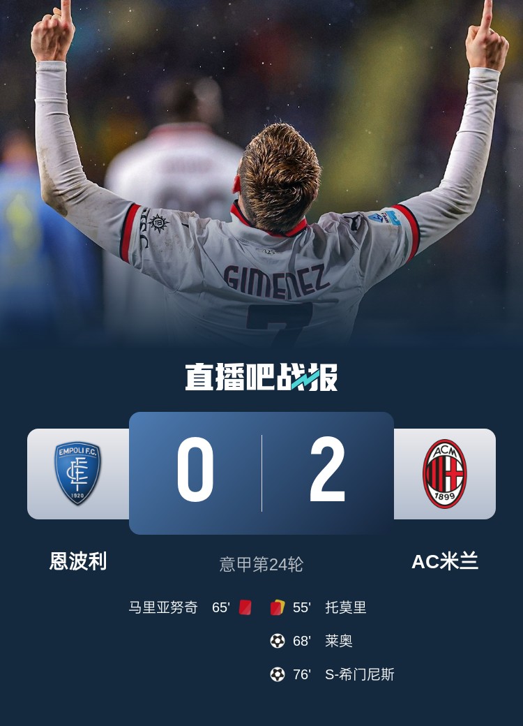 米蘭本輪2-0擊敗恩波利,雙方在下半場都被罰下一人,最終米蘭憑借萊奧和新援S-希門尼斯的進球拿下勝利。