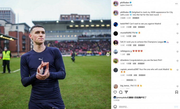 福登也達(dá)成了曼城生涯300次出場里程碑,賽后他在個人社媒曬出本場照片,配文寫道:“很高興能以一場勝利紀(jì)念自己的曼城300場之戰(zhàn),挺進(jìn)足總杯下一輪!”