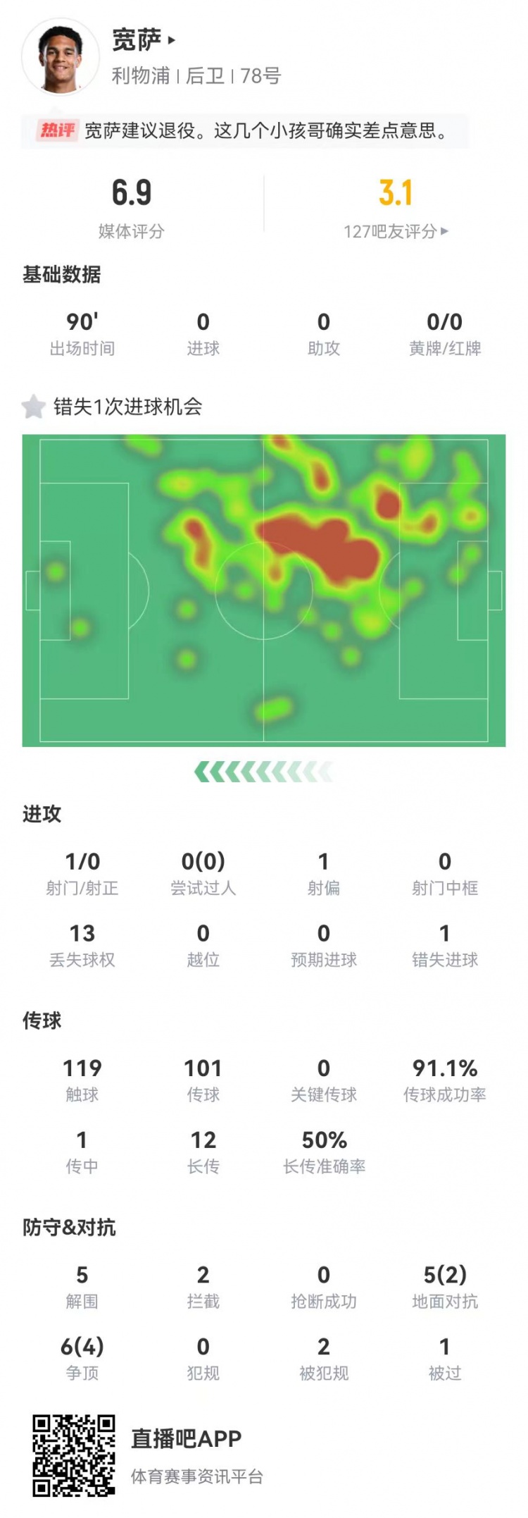 2月10日訊 利物浦在本輪足總杯0-1爆冷不敵普利茅斯,寬薩本場數(shù)據(jù)如下: