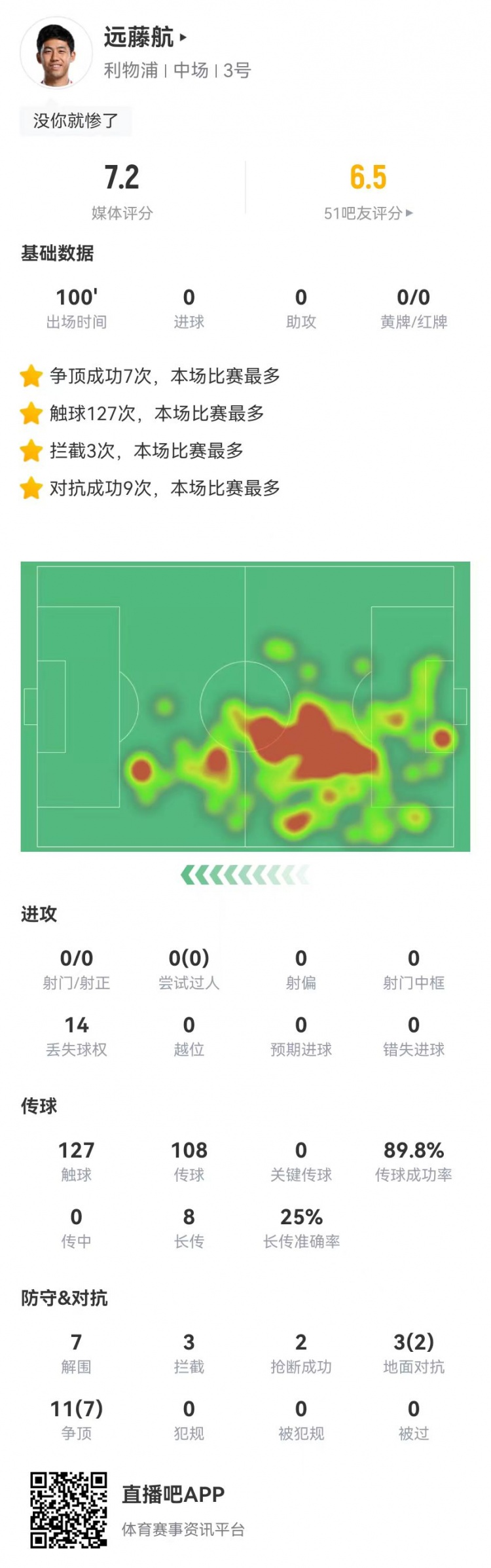 2月10日訊 利物浦在本輪足總杯0-1爆冷不敵普利茅斯,遠(yuǎn)藤航本場數(shù)據(jù)如下: