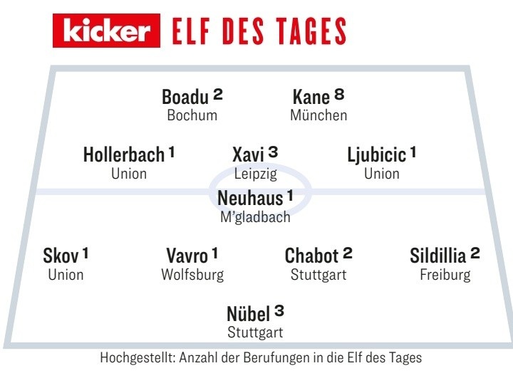 2月10日訊 德甲第21輪已經完賽,《踢球者》評出了本輪德甲最佳陣容,凱恩領銜。