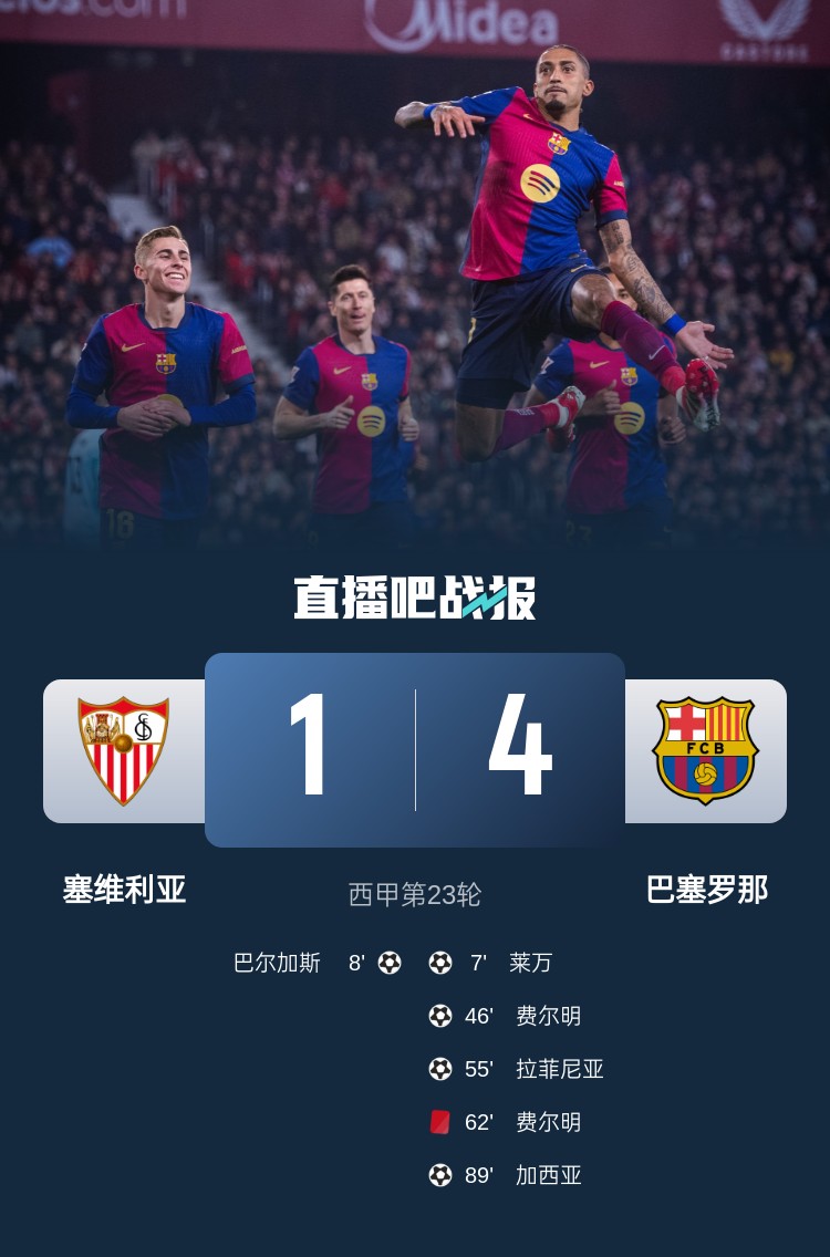 西甲第23輪,巴薩4-1塞維,距離榜首僅差2分。上半場(chǎng),萊萬(wàn)墊射破門(mén),巴爾加斯1分鐘后迅速扳平,阿勞霍被鏟傷退;下半場(chǎng),費(fèi)爾明頭球,拉菲尼亞再下一城,費(fèi)爾明紅牌,補(bǔ)時(shí)前埃里克-加西亞再進(jìn)一球。