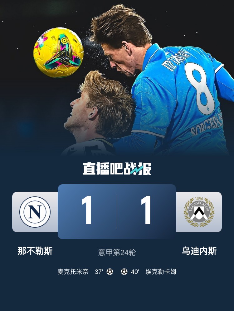意甲第24輪,那不勒斯1-1戰(zhàn)平烏迪內(nèi)斯。上半場(chǎng),麥克托米奈率先打破僵局;??死湛钒馄奖确?。下半場(chǎng),雙方均無(wú)建樹(shù)。