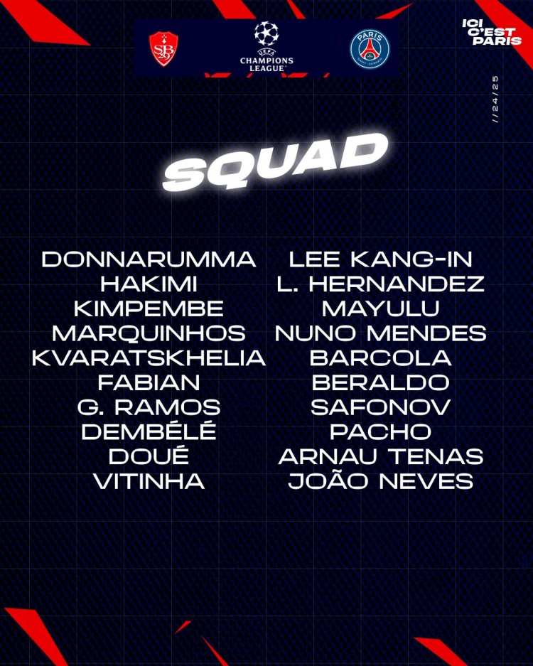 2月10日訊 北京時間2月12日凌晨,巴黎將在歐冠淘汰賽附加賽首回合比賽中客場對陣布雷斯特,巴黎公布了此役的球員名單,登貝萊、克瓦拉茨赫利亞、若昂-內維斯在列,扎伊爾-埃梅里繼續(xù)缺席。