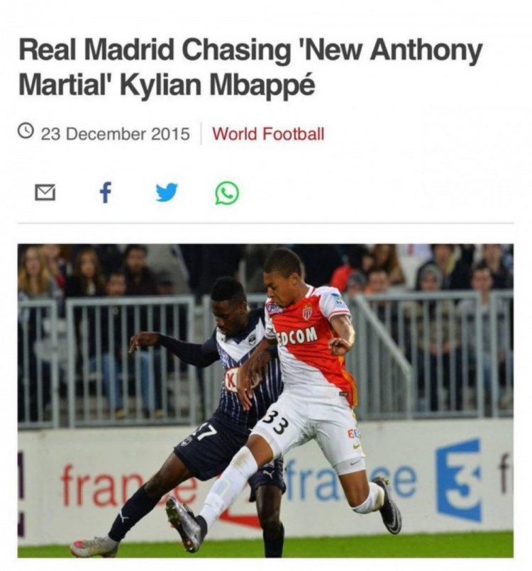 考古報道:2015年12月,皇馬追逐“新馬夏爾”——基利安-姆巴佩
