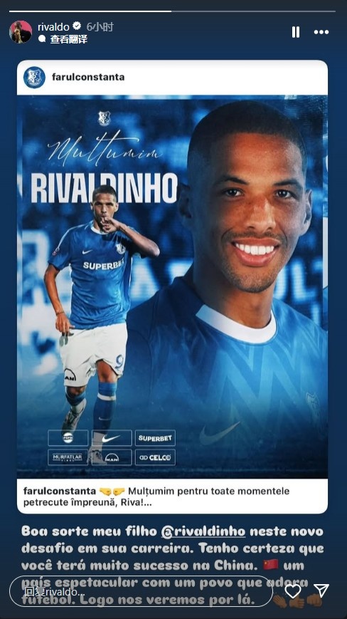 在個(gè)人社媒,里瓦爾多曬出里瓦爾迪尼奧加盟青島紅獅的官方照,同時(shí)配文:“祝我的兒子在職業(yè)生涯的新挑戰(zhàn)中好運(yùn),我相信你在中國(guó)一定會(huì)成功,中國(guó)是一個(gè)有著熱愛(ài)足球的人民的國(guó)家,很快就會(huì)見(jiàn)面?!?/p>