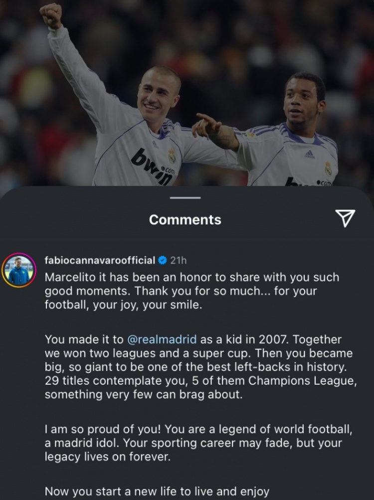 卡納瓦羅表示:“小馬塞洛,能榮幸能夠和你共享一段美好時(shí)光。非常感謝你的足球技術(shù)以及你的快樂(lè)感染力。你在2007年加盟皇馬時(shí)還是一個(gè)孩子,我們共同贏得了2座西甲和一座西超杯。而自那之后,你成長(zhǎng)為了足壇歷史最佳左后衛(wèi)之一。”