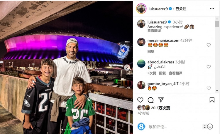 目前效力于邁阿密國際的蘇亞雷斯現(xiàn)場觀看了比賽,他在社交媒體上曬出與孩子在體育場外的合照,并配文:“很棒的體驗?!?/p>